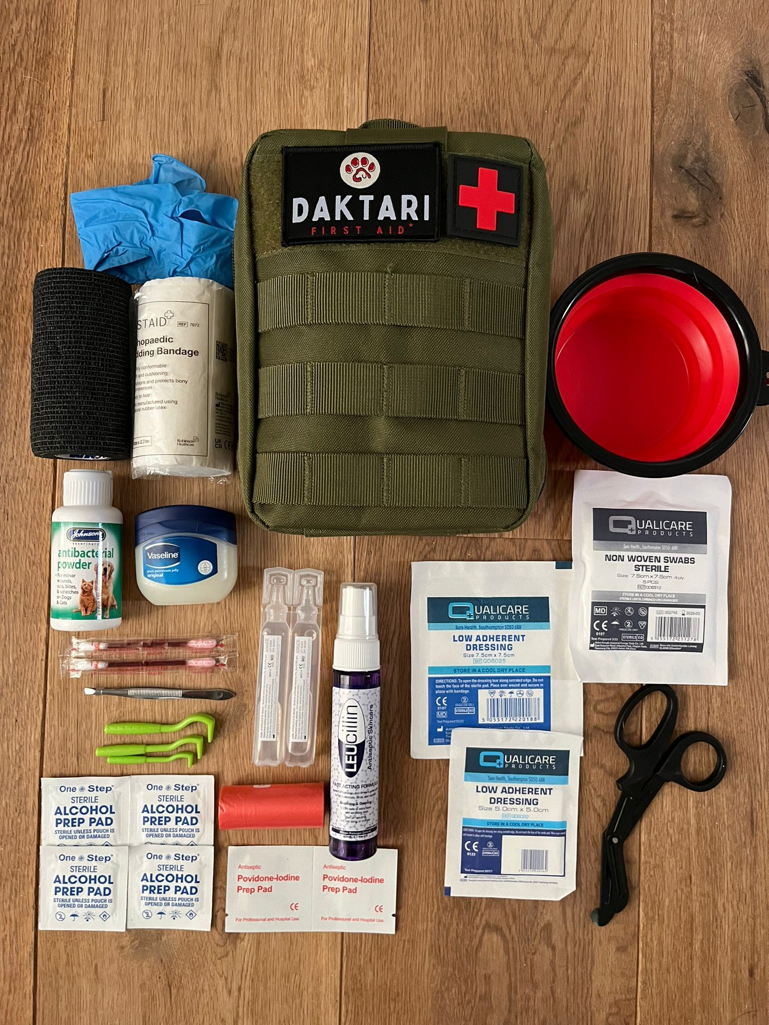 First Aid Kits for Dogs – Its all too easy to hope that you never have an accident or emergency when your out and about, from cuts and scrapes, to pulled claws and ticks, whether that is on a walk, up a hill, on the beach, playing in the park or staying away. Being prepared not only can save you money but reduce stress and prevent further injury or infections. Stay prepared for any adventure with our portable dog first aid kit. Compact yet filled with essentials for on the go emergencies. Accidents can and do happen so don’t get caught out and have your kit close at hand. Having been a dog owner for many years, I know the trials and tribulations of having dogs, I couldn’t find anything on the market suitable so for taking with me so I started making my own. . . . . . . Daktari helping you to help your dog